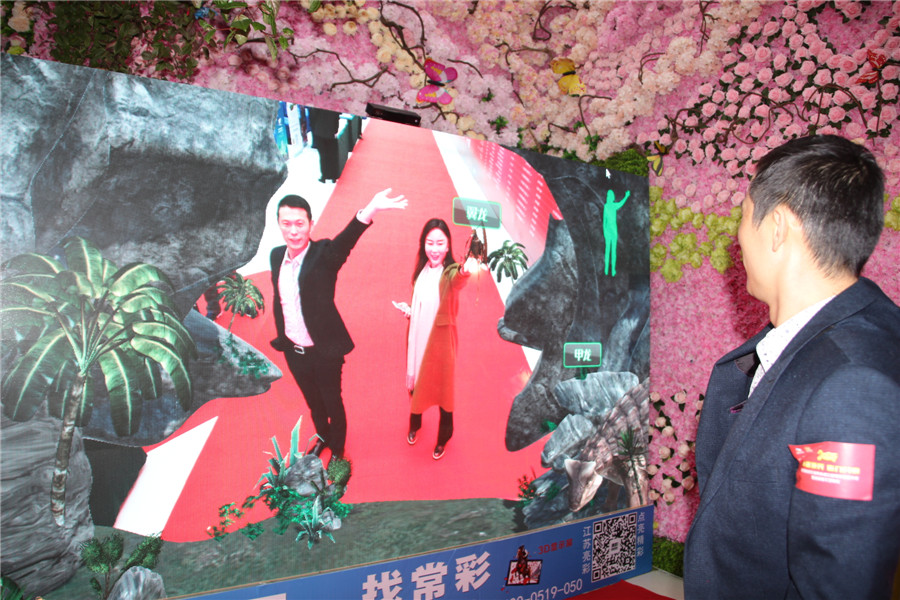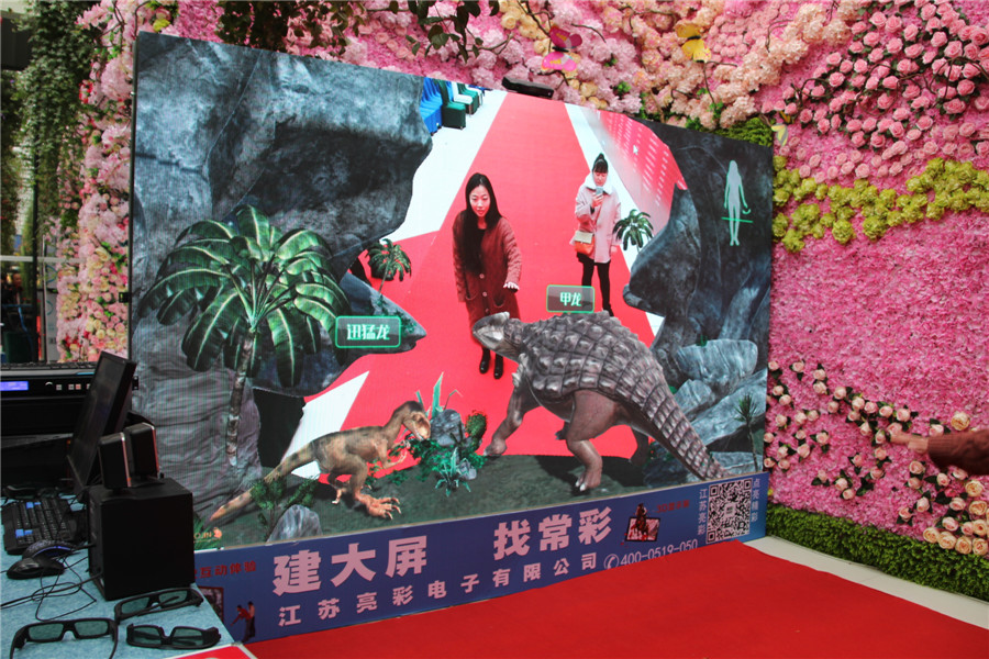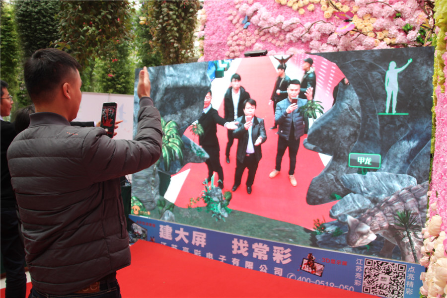 在會場的一側入口處,江蘇亮彩電子展示了時下最火的LED+3D+AR技術,通過大屏幕與人的互動,不少參會人員在一旁圍觀,也想體驗一把。