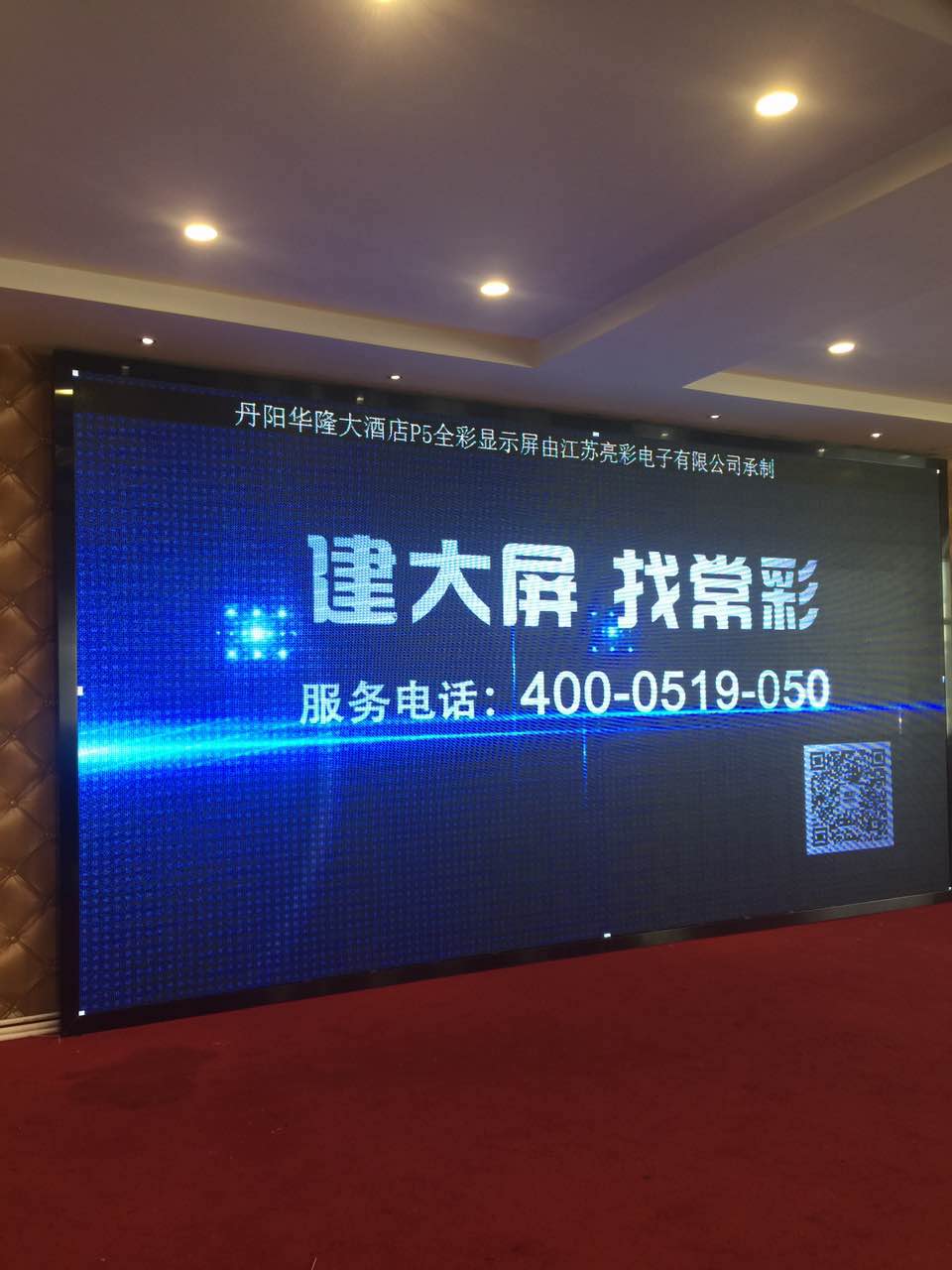丹陽市華隆大酒店的屏室內P5全彩LED顯示屏由江蘇亮彩電子有限公司承建,江蘇亮彩LED顯示屏制造廠家生產的P5顯示屏憑著選材優質,播放效果高清、色彩還原性好等優點得到客戶認可。